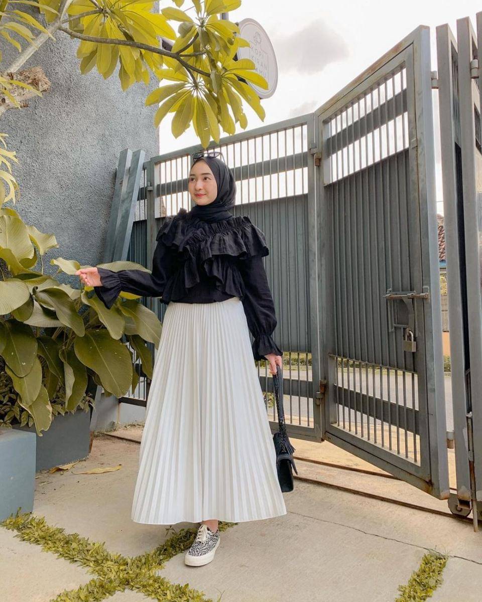 3. Kamu juga bisa memadukan blouse warna hitam dengan hijab pashmina warna hitam, pleated skirt putih dan sneakers, simpel dan elegan buat OOTD!