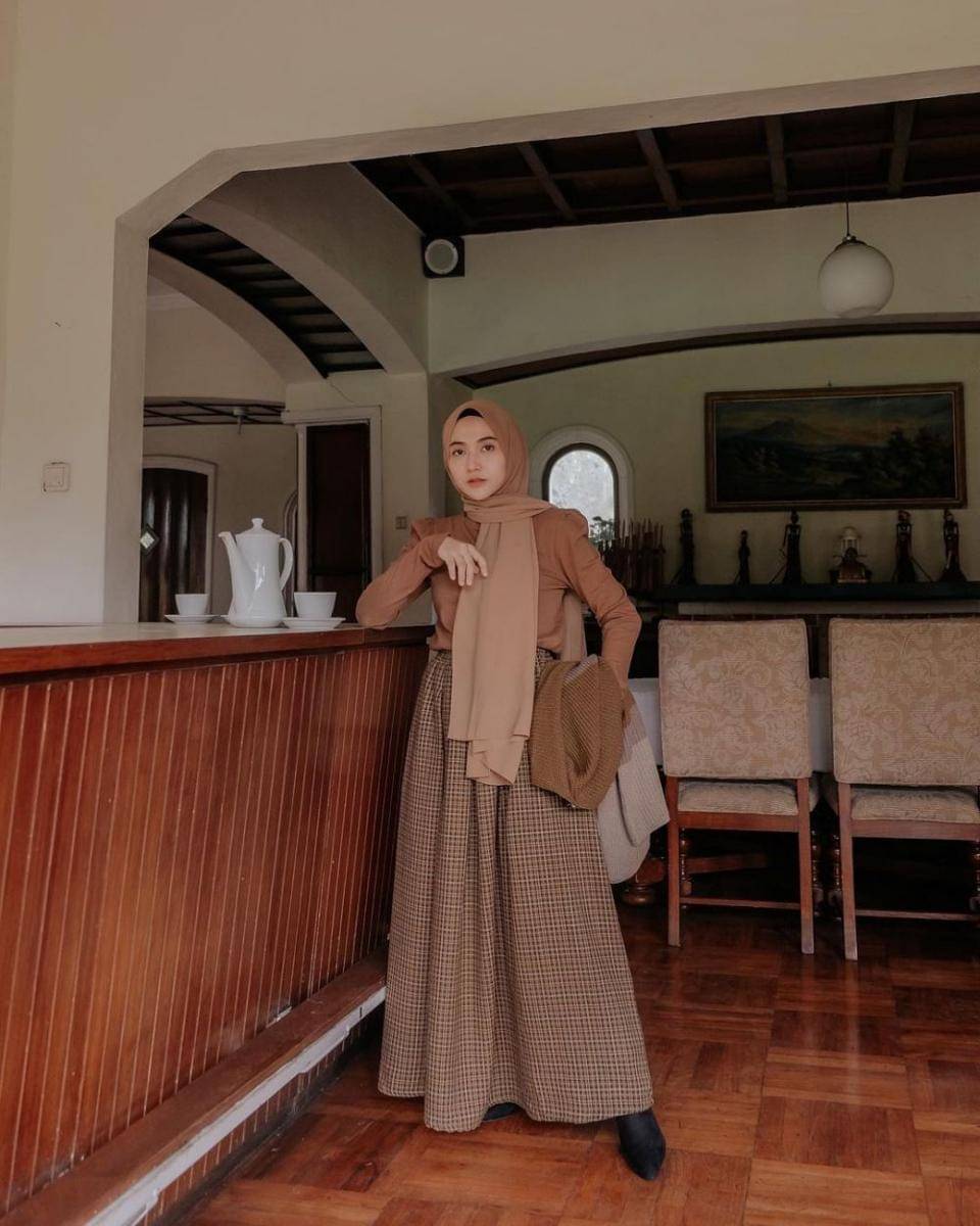 1. Kamu hanya perlu memadukan blouse berwarna mocha, hijab pashmina warna senada, oxford skirt nuansa mocha serta boots untuk tampil kece!
