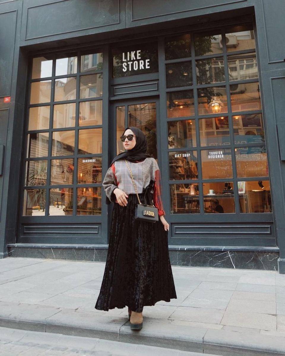 5. Memadukan blouse dengan bludru skirt hitam dan pashmina warna senada serta platform shoes, bakal bikin penampilanmu makin chic