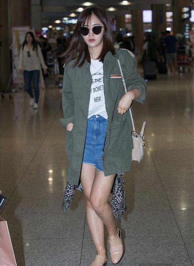 9. Padukan blouse warna cream dengan asymmetric skirt jeans dan stiletto shoes ala Sooyoung, eye catching abis!