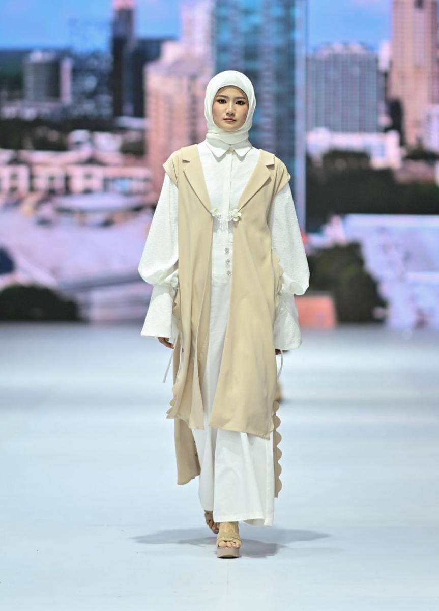 4. Ada pakaian kerja khusus yang berhijab dari long dress putih lengan bishop, di-mix sleeveless long outer nuansa beige. Kalem dan stylish abis!