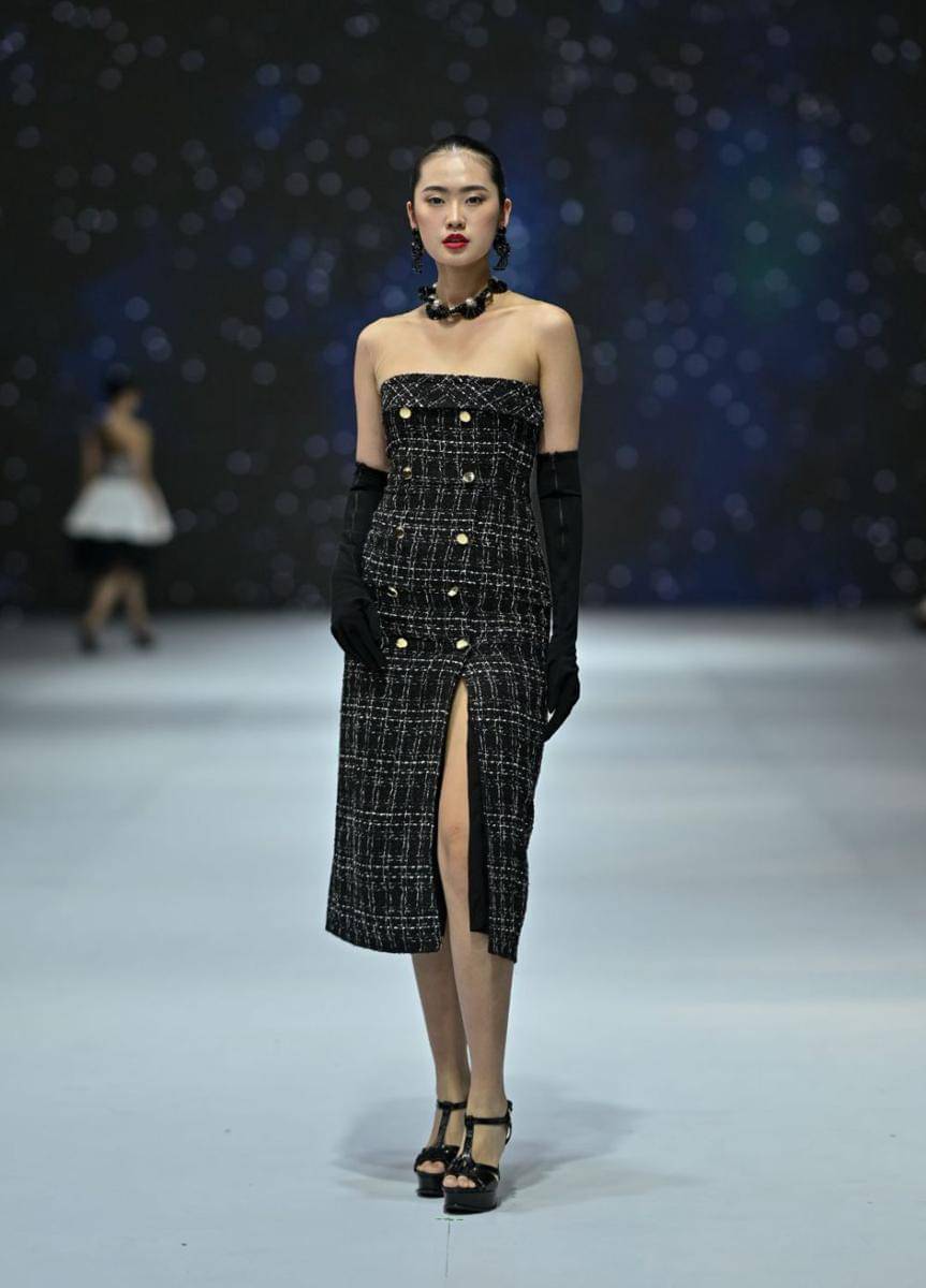 11. Beralih ke pakaian formal di malam hari. METRO Group hadirkan tweed dress beraksen slit. Long gloves dan kalung jadi penyempurna look!