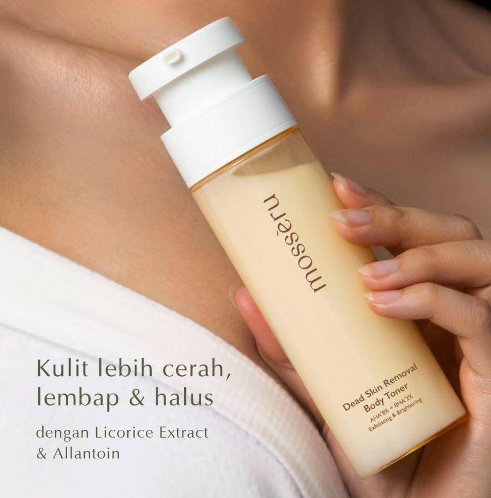 Rekomendasi body toner eksfoliasi berikutnya yaitu dari MOSSÈRU. Dead Skin Removal Body Toner merupakan toner badan yang menjadi solusi untuk mengangkat sel kulit mati, kotoran hingga daki, maka, kulit dapat terlihat halus dan mencerahkan.
