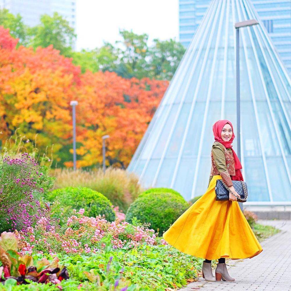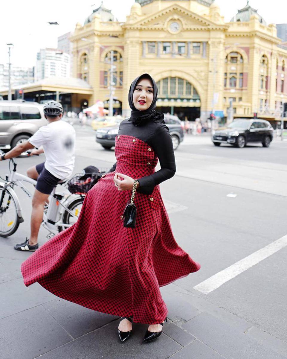 5.Elemen retro terlihat dari rok kuning dengan potongan flare yang klasik, dipadukan dengan jaket motif etnik serta hijab merah sederhana dan sepatu boots modern melengkapi tampilan dengan gaya kontemporer