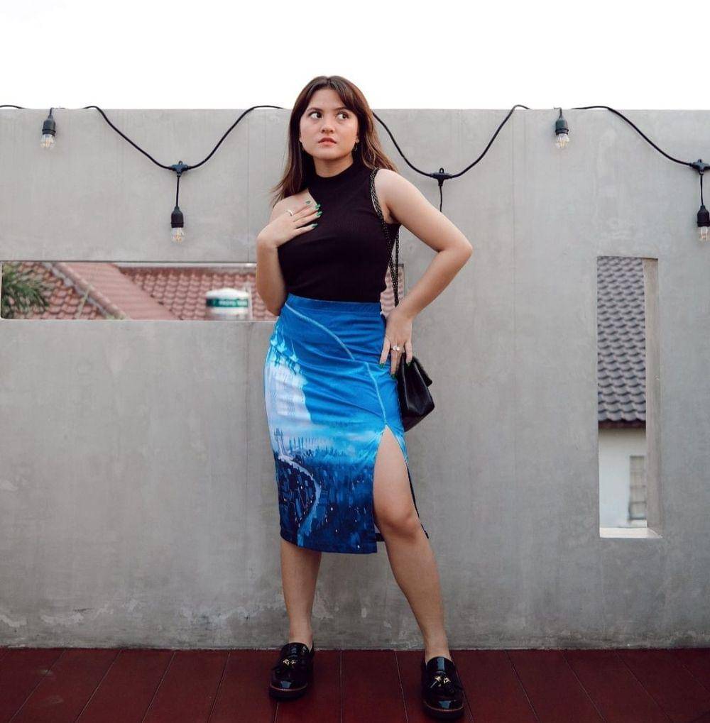 6. Untuk tampilan yang lebih girly, kenakan sleeveless top hitam dengan printed silk skirt biru dengan belahan
