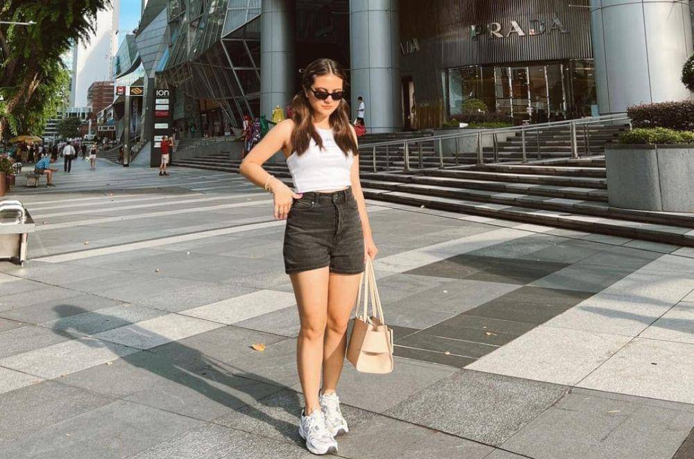 7. Terakhir, Marsha mengenakan sleeveless crop top putih dengan short pants hitam dan sneakers putih