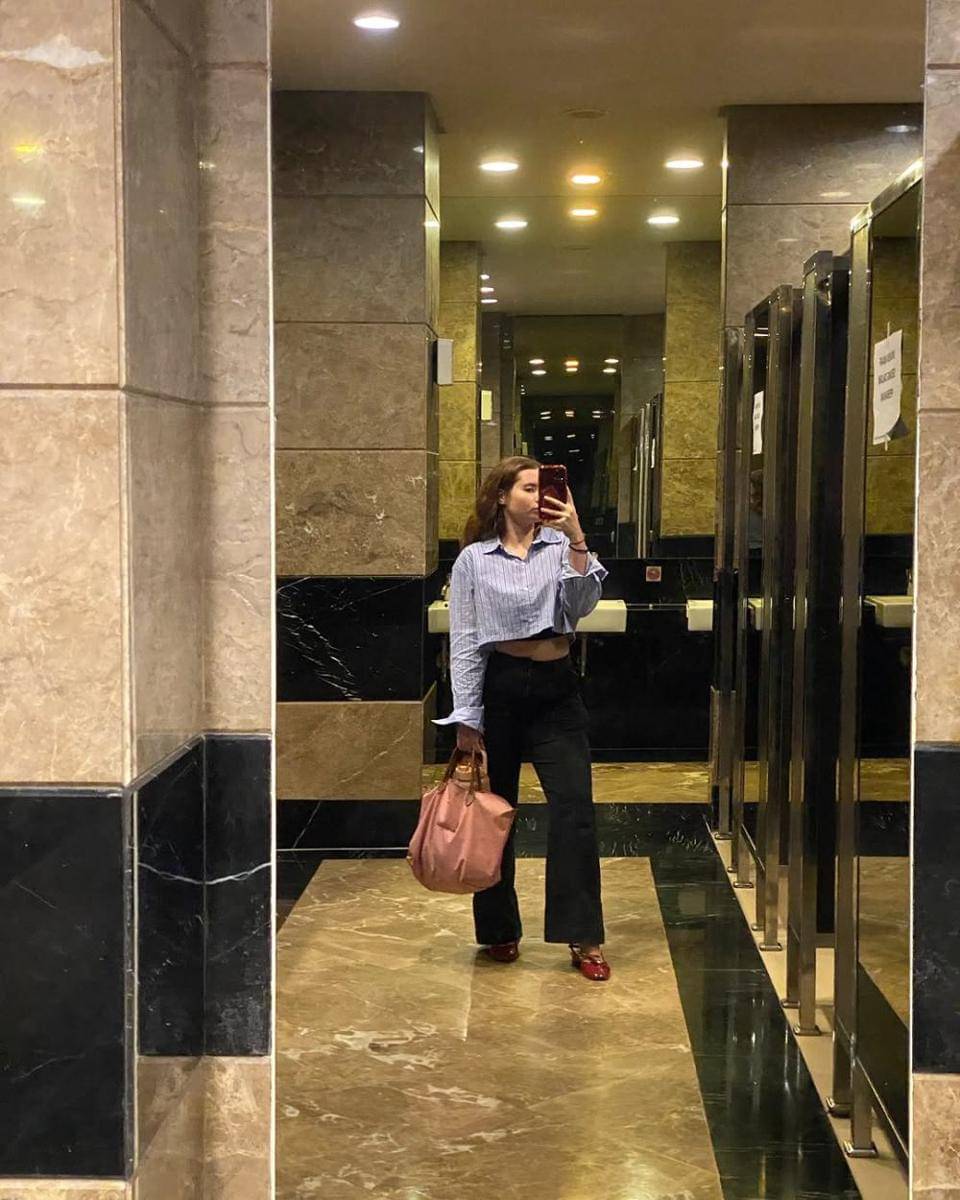 2. Kemeja cropped juga boleh kok kamu pakai dengan celana hitam polos. Padu dengan sepatu mules dan tas favoritmu, ya!
