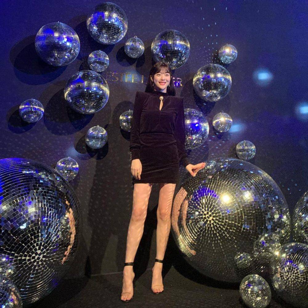 3. Terlihat feminin, teman IU ini memadankan dress berwarna hitam dengan strap heels warna senada