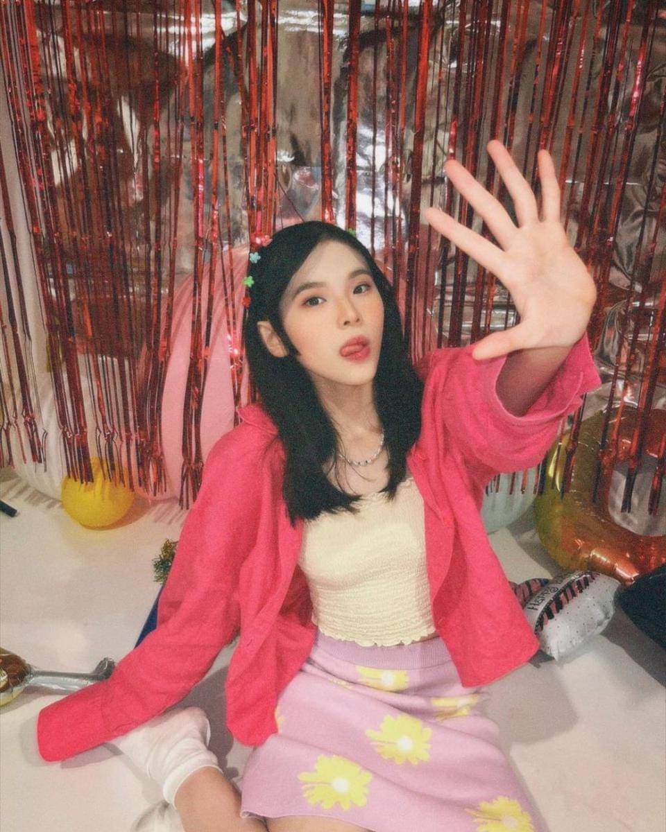 4. Look super manis dari Lyn: padukan inner top kuning pastel dan rok pink dengan pola bunga serta outer berwarna senada sebagai pelengkap