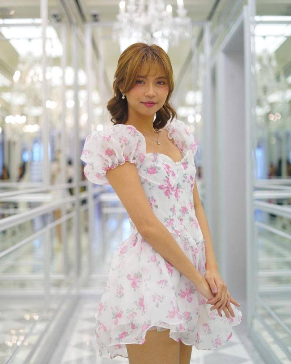 7. Dress yang didominasi pola bunga pink serta dilengkapi dengan puff sleeve ini akan membuat kamu terlihat anggun dan manis seperti Eli