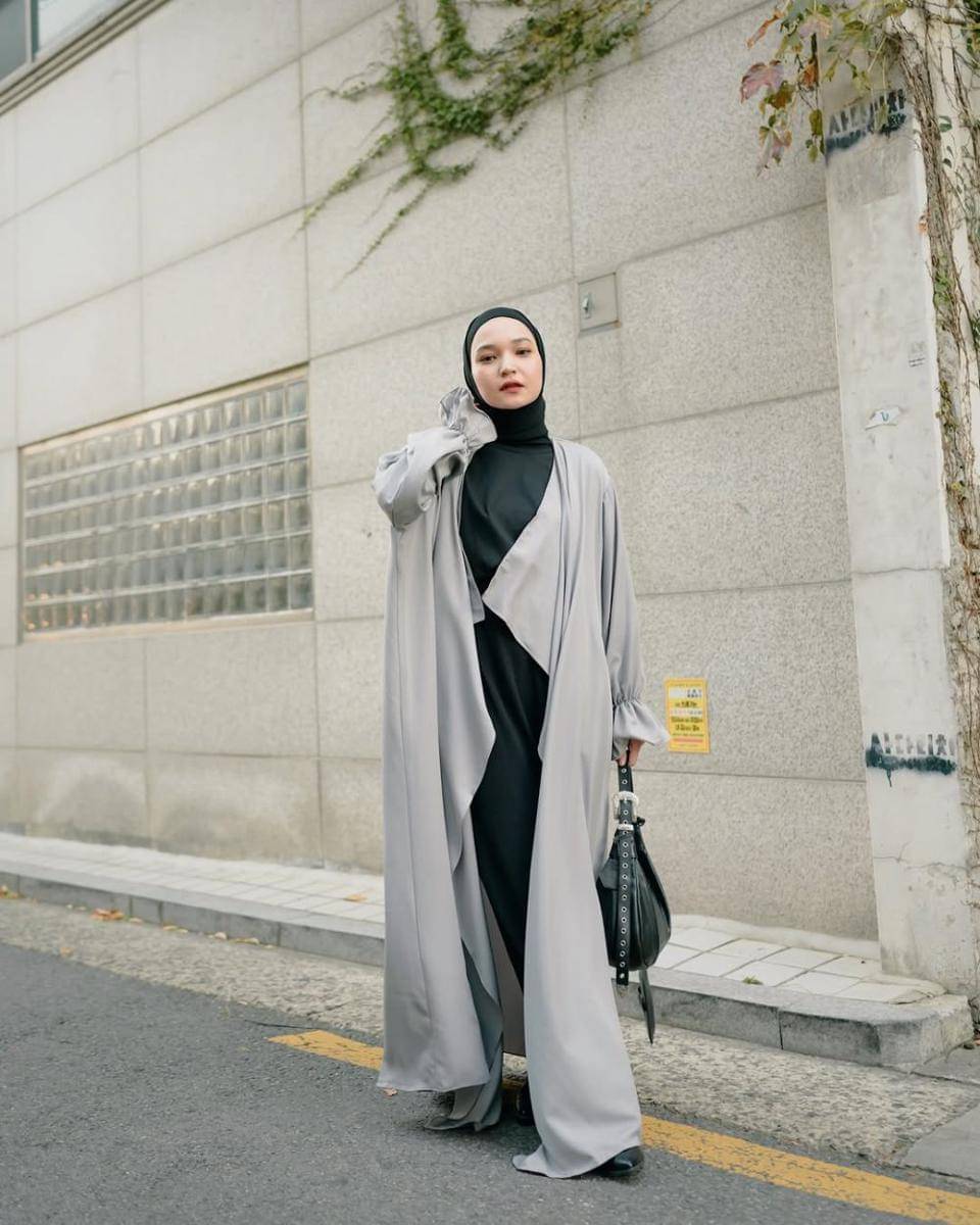 2. Outfit bukber yang simple namun tetap stunning, kenakan inner, abaya, loafers shoes, dan hand bag nuansa hitam