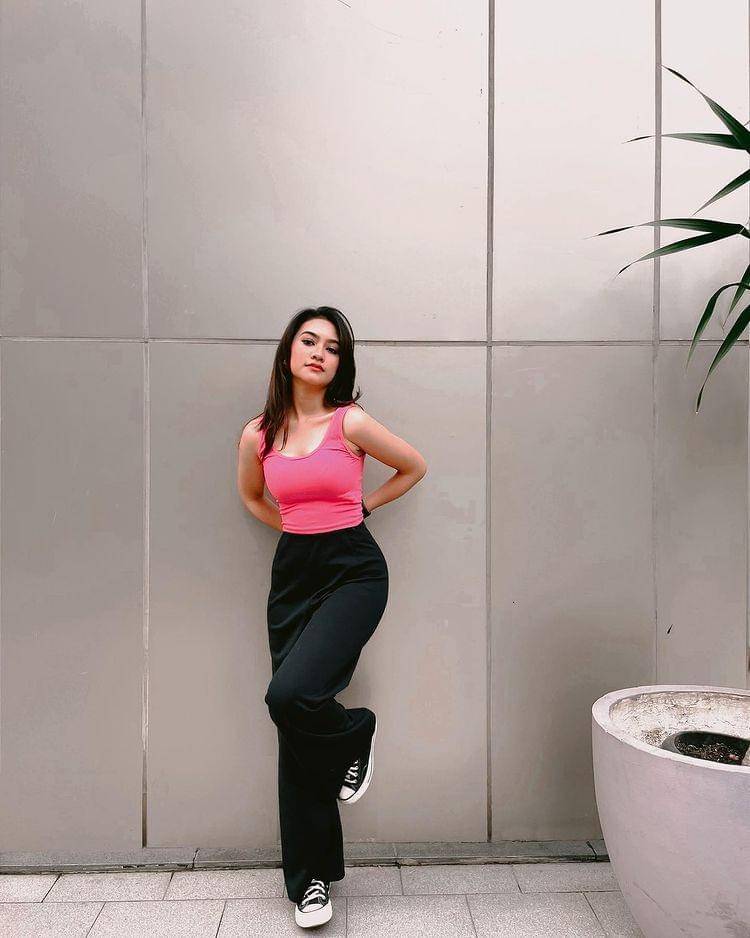 1. Pants hitam dengan pink tank top adalah perpaduan simple yang bisa kamu pakai hangout, untuk alas kaki kenakan sneakers