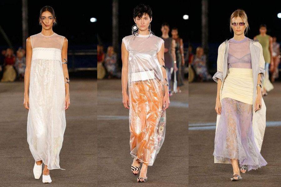1. Tory Burch memperlihatkan koleksinya berupa bra, celana kulot, dan flat shoes yang dilapisi long dress transparan. Unik banget!
