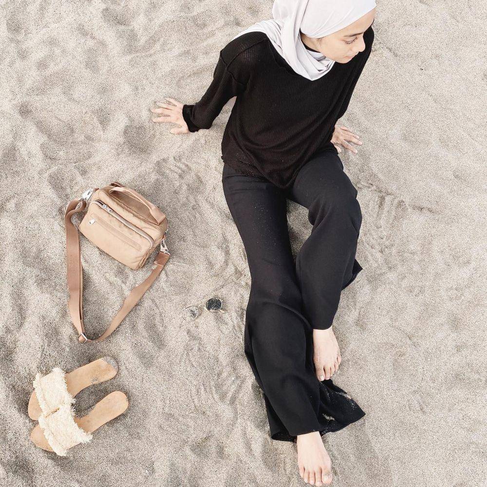 7. Bingung dengan outfit ke pantai? Padukan saja pashmina warna putih gading dengan long sleeve t-shirt dan bootcut pants. Effortless!