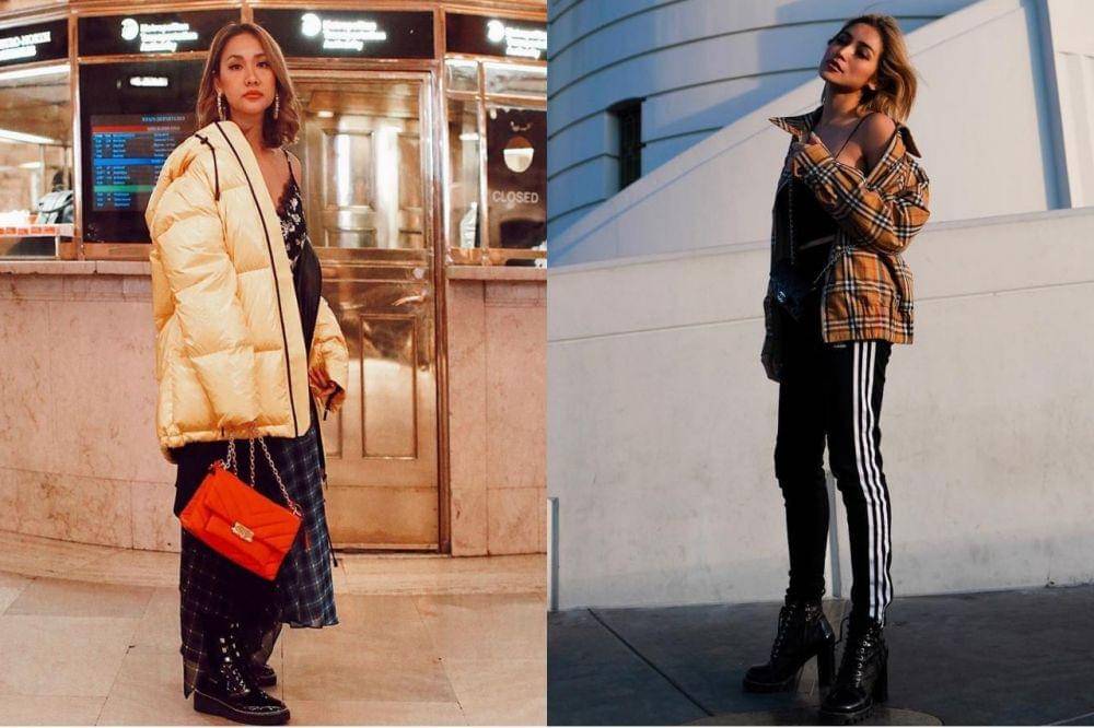 6. Kombinasikan tanktop, sling bag, dengan down jacket ala BCL. Ala Jedar, perpaduan jaket motif kotak dengan celana garis. Siap liburan, nih!