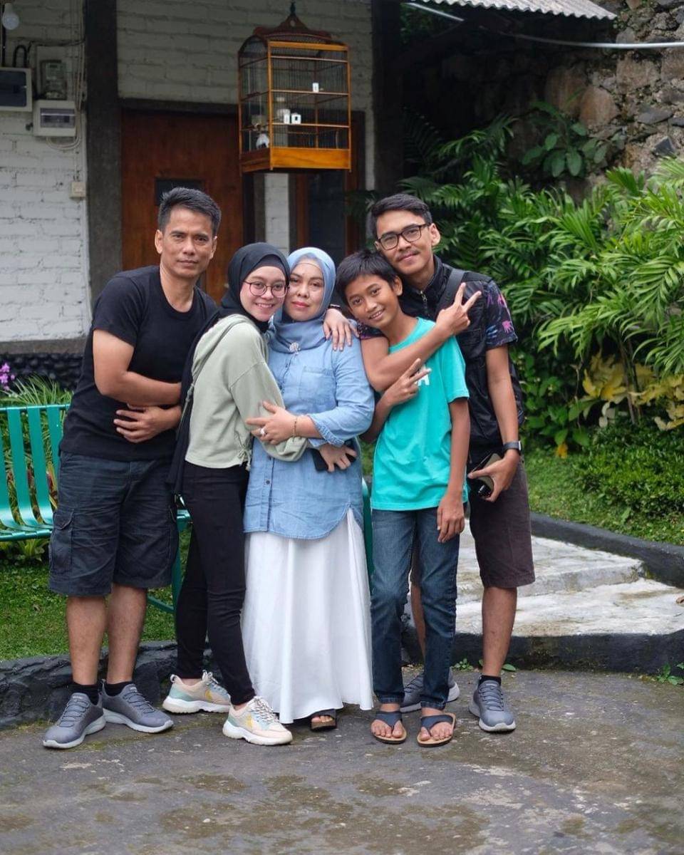 2. Lesti pilih baju warna hijau pastel saat bersama dengan keluarga, sementara Mama pilih kemeja denim dan jilbab senada