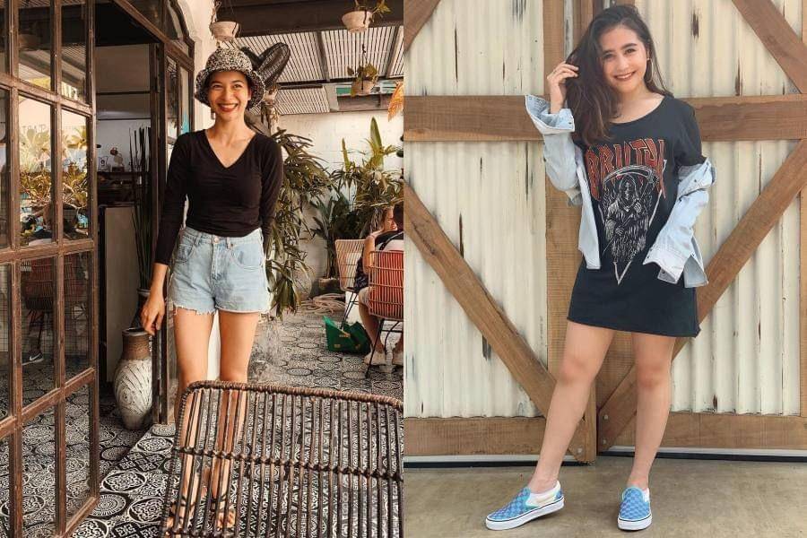 5. Gaya traveling tetap kece dengan short pants serta sneakers. Pilih atasan kaus polos dan scarf ala Putri atau crop sweater pink milik Prilly?