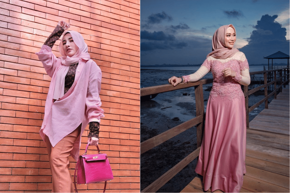 Dengan outfit bernuansa pink, aura girly dari keduanya semakin terlihat. Shandy padukan kaus lengan panjang cokelat dengan kemeja oversize pink dan celana peach.