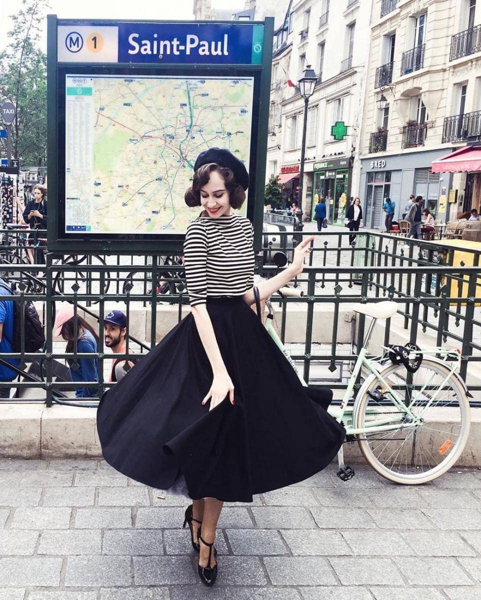 9. Jika ingin lebih santai, kamu bisa memakai kaos berwarna hitam dengan black circle skirt, jangan lupa tambahkan topi beret biar lebih elegan