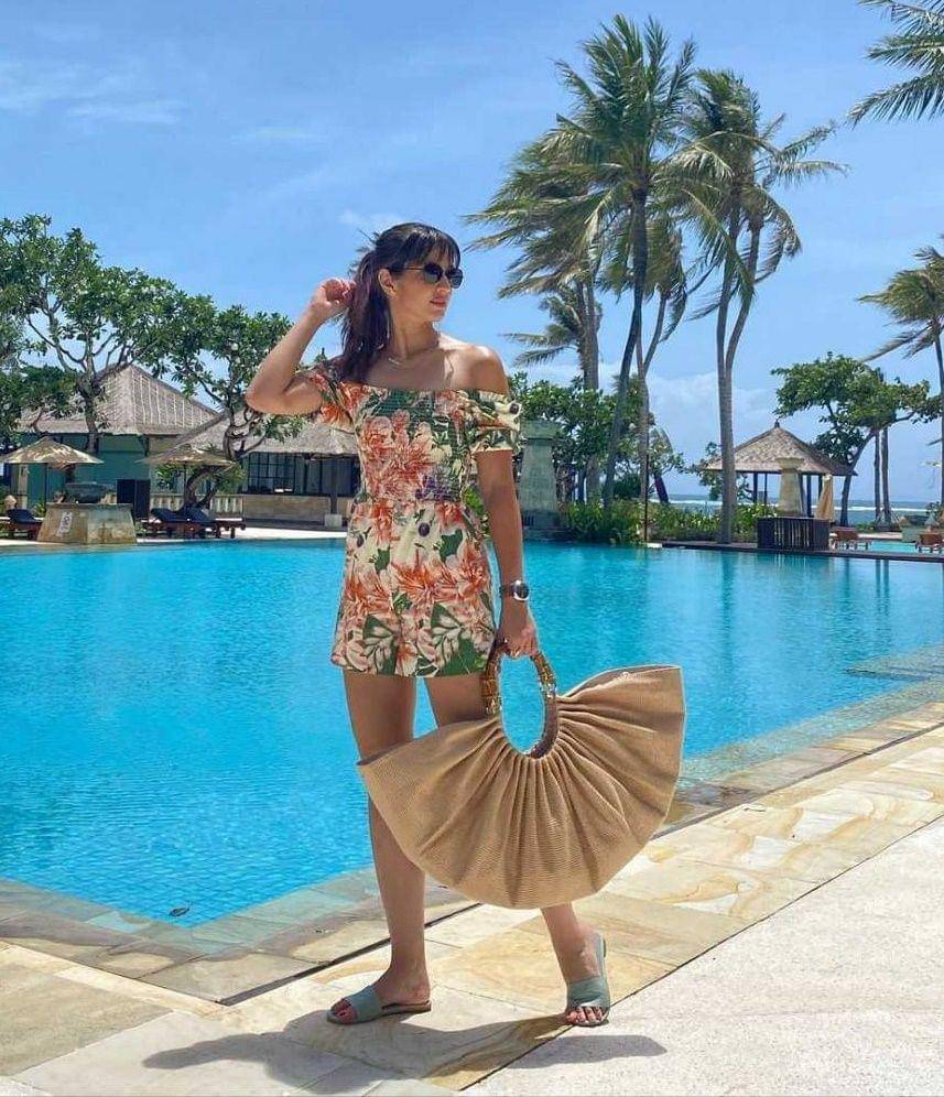 7. Mini jumpuit tropical model kerah sabrina kece dipadu half moon bag dan flat sandal. Jangan lupa sunglasses!