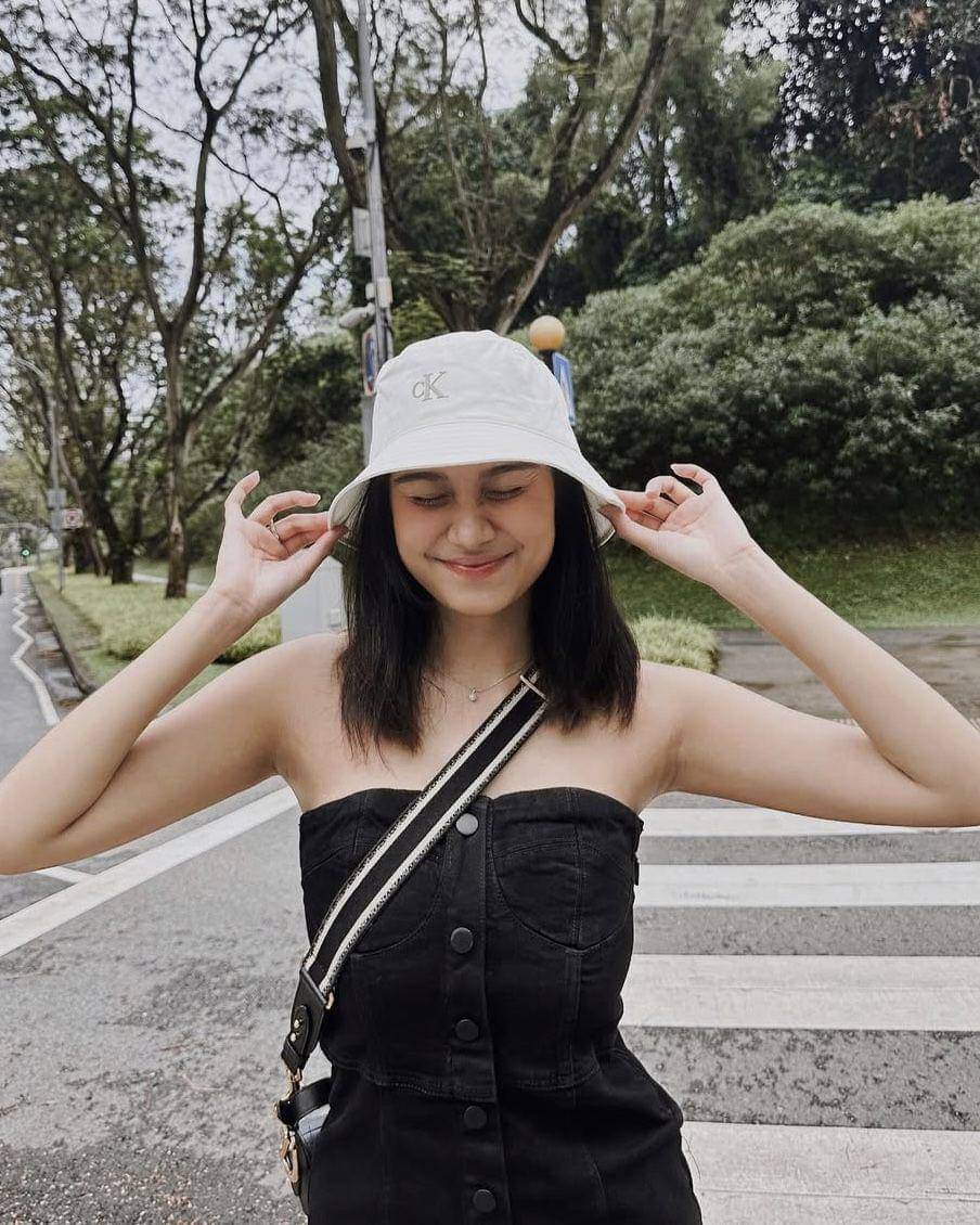 3. Dibuat tampil super minimalis dengan gaya rambut model bob medium haircut. Casual look dengan sentuhan bucket hat, nih
