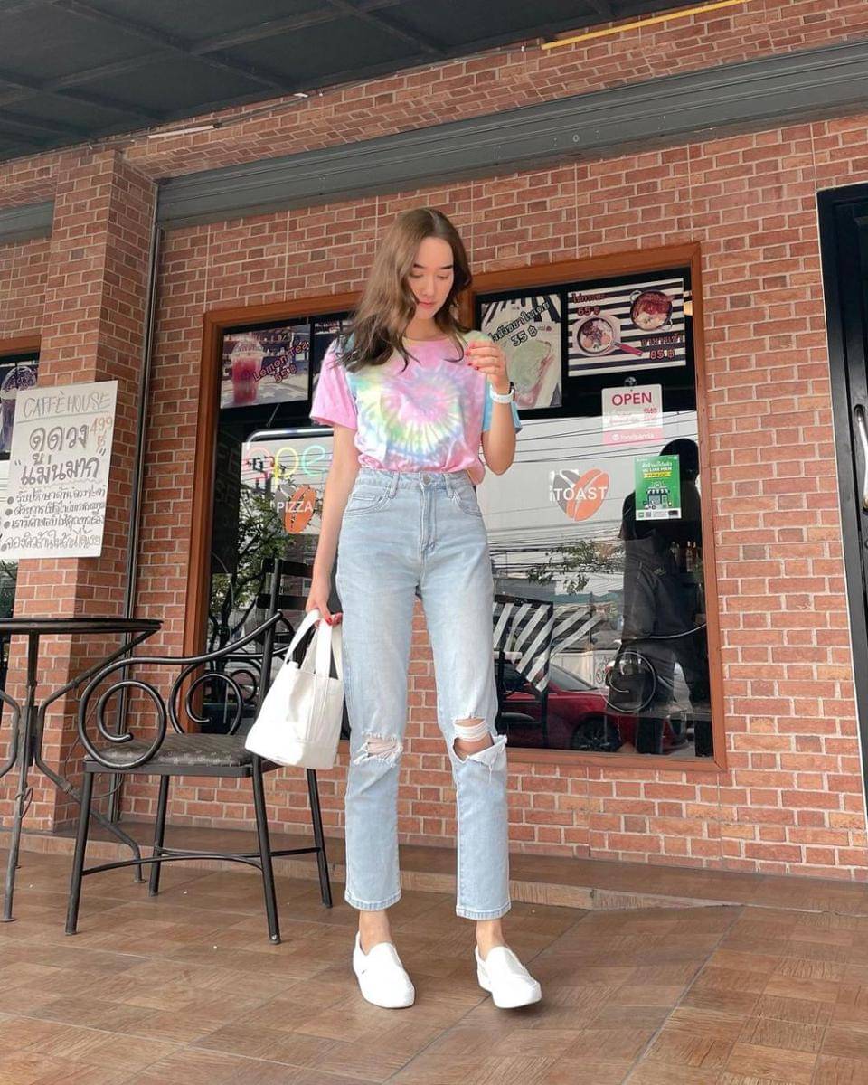 3.Mau nongkrong santai bareng teman? Padukan T-shirt tie dye dan rapid jeans, tambahkan aksesoris serba putih seperti sepatu dan tas