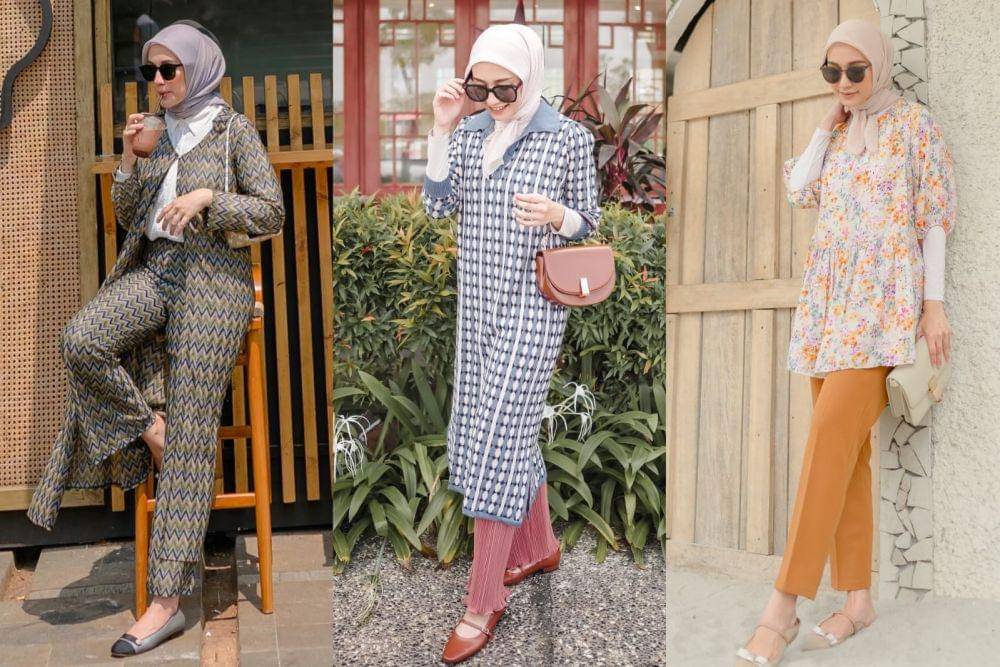 3. Tunik bermotif warna biru yang dipakai dengan inner manset, hijab putih, loose pants serta flat shoes, cocok dipakai saat jalan-jalan
