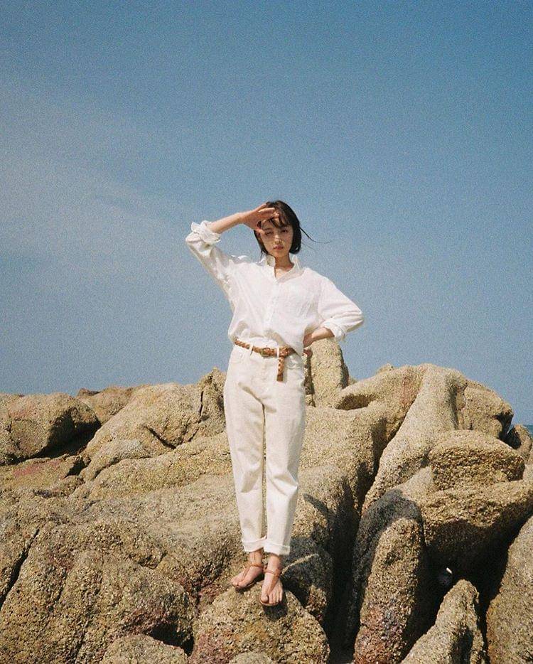 7. Cocok buat dipakai foto outdoor, gunakan kemeja putih polos, padukan dengan celana putih dan belt coklat serta sandal, manis banget!