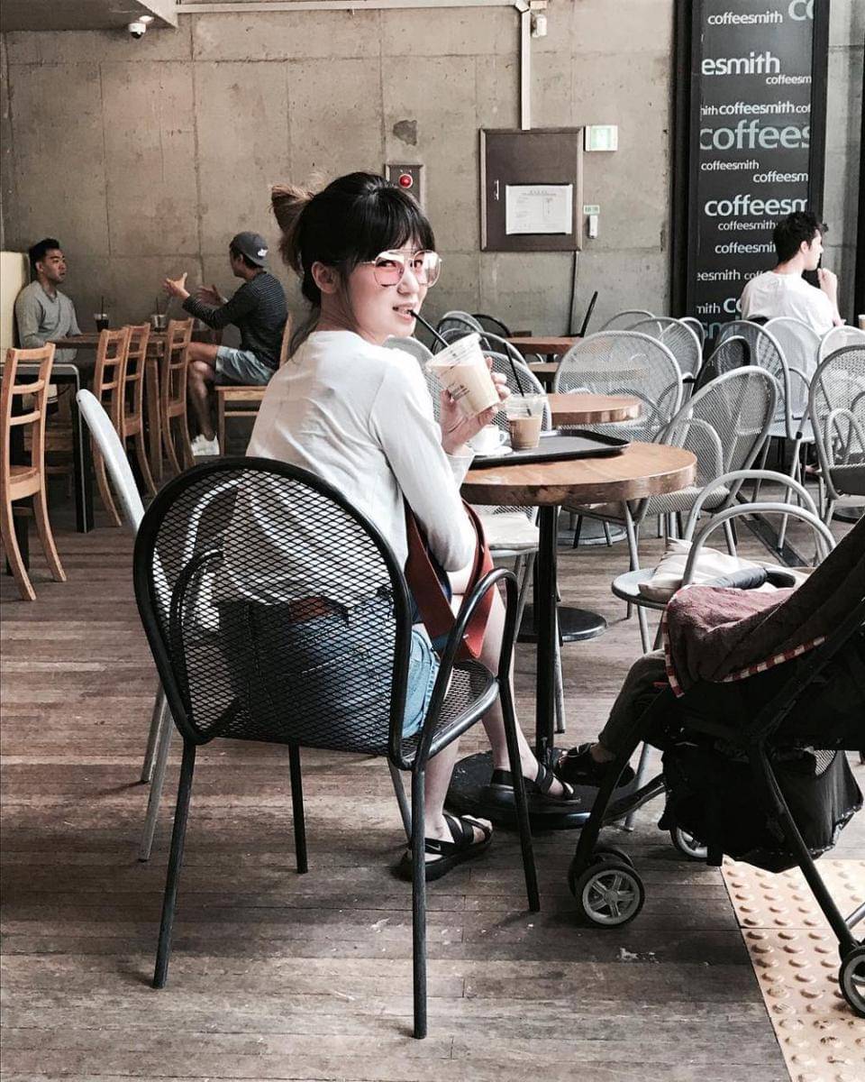 8. Liburan ke Lotte World Korea, ini outfit feminin Laura Basuki. Dia pilih kimono top warna krem dengan motif floral dipadukan rok