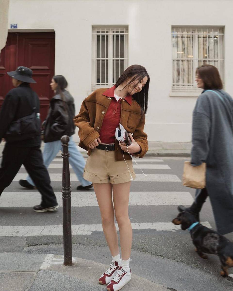6. Style berikutnya, Jenny Tsang terlihat memadukan jaket dark brown dengan celana jeans, topi cokelat, dan sneakers putih