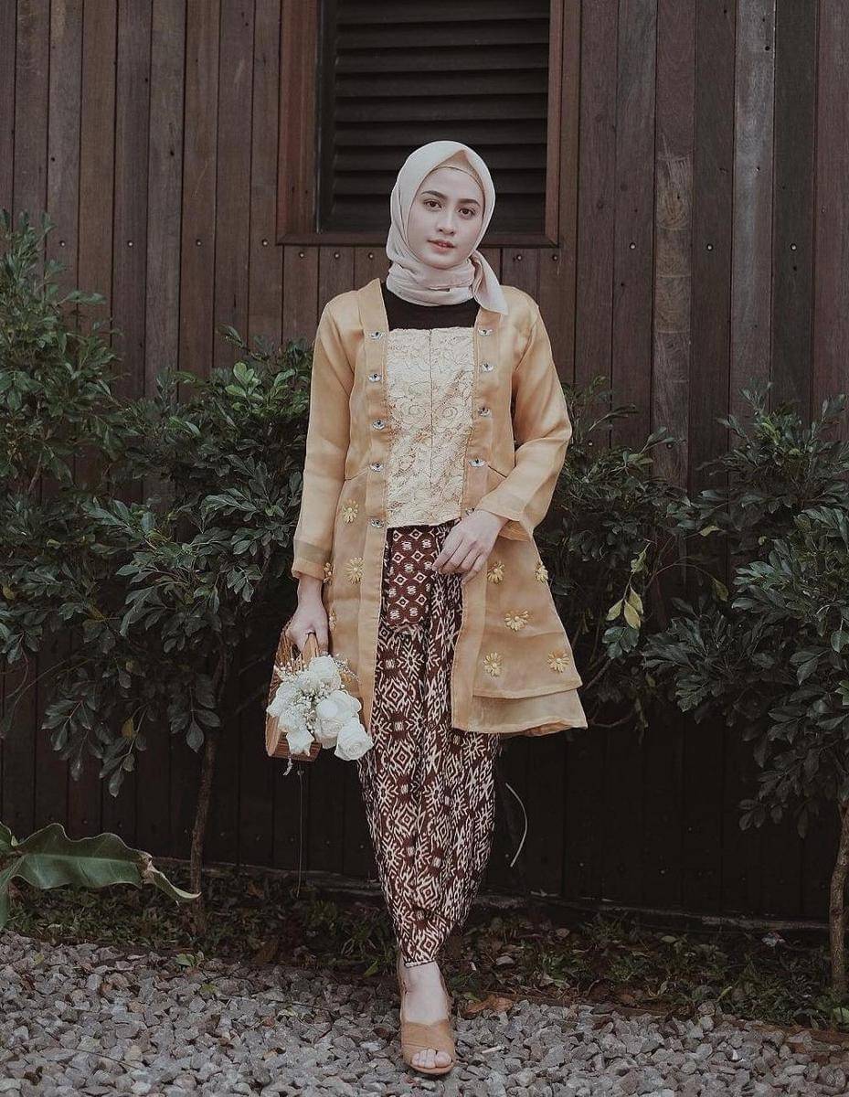 5. Kebaya kutubaru dengan bordiran yang apik nan menggemaskan, tampak serasi dipadankan dengan hijab lilit dan clutch batik parang warna senada