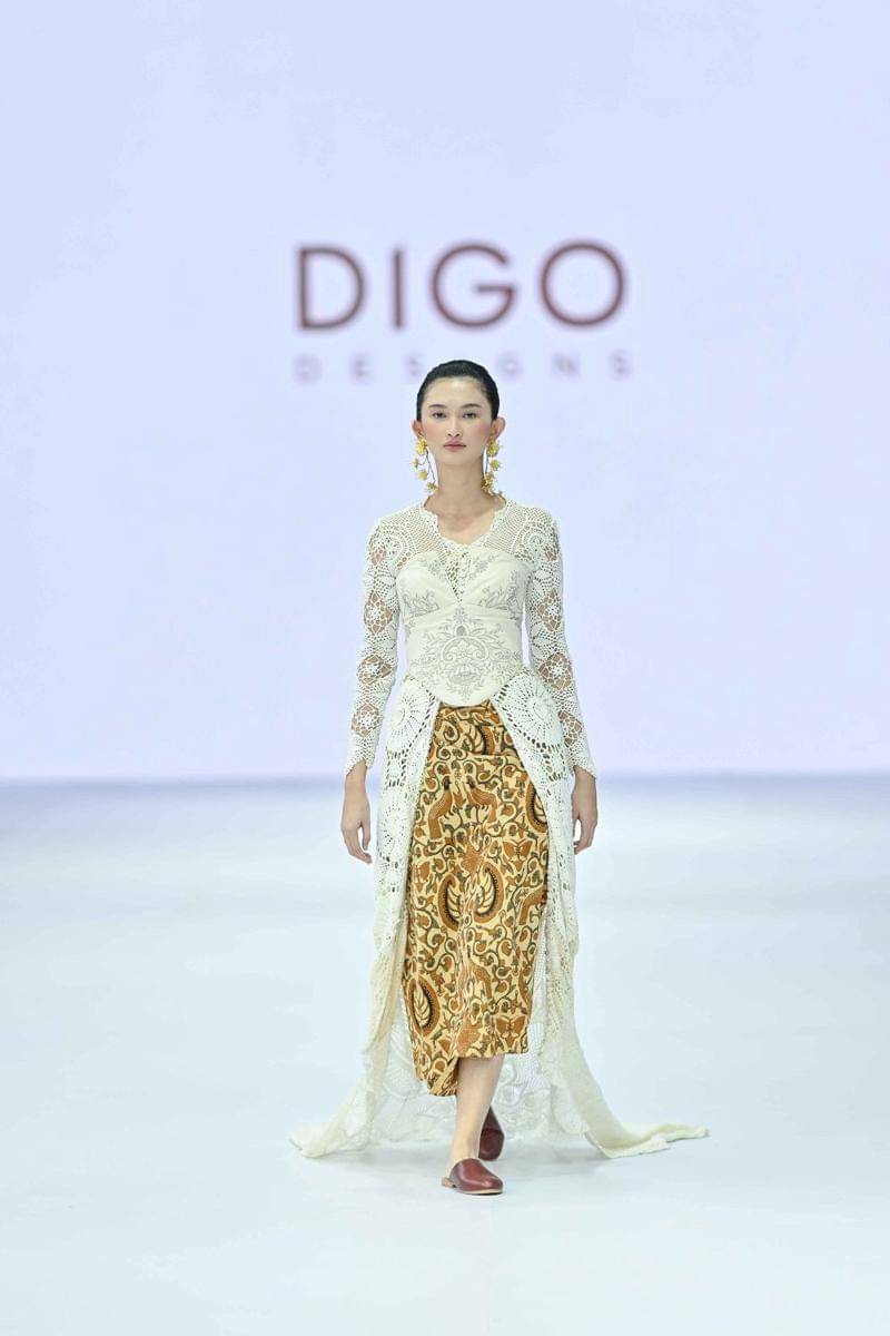 7. Digo Design menampilkan kebaya Jawa klasik dengan twist modern, menggabungkan lace berpola geometris yang unik dengan batik motif semen