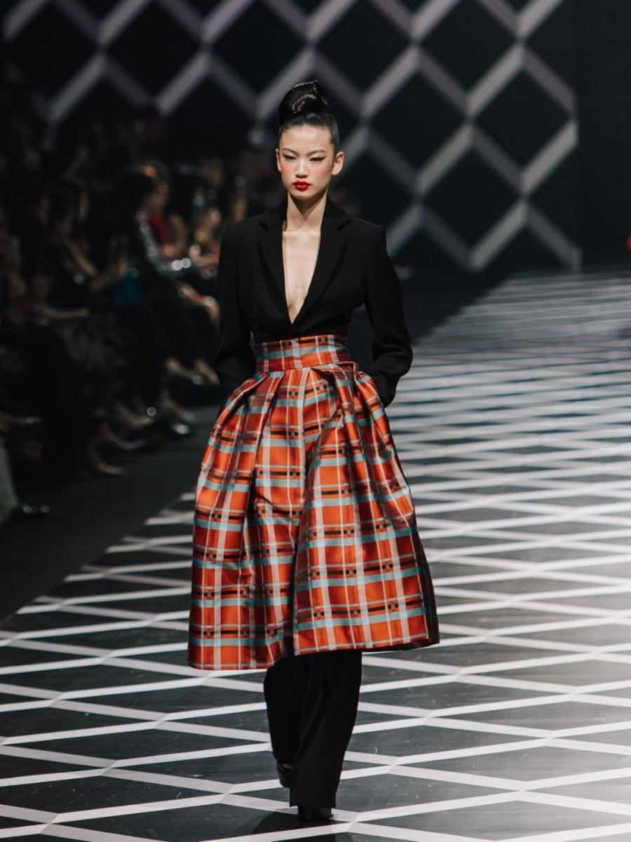 Satu suit jas dan celana panjang dibuat hybrid dengan rok lonceng bermotif tartan. Bagian atas gaun banyak berpotongan halter yang menonjolkan keindahan bahu, namun ada juga potongan bahu-bahu tertutup dengan long coat, cape, jacket, atau sisi lengan bersiluet puff yang romantis.
