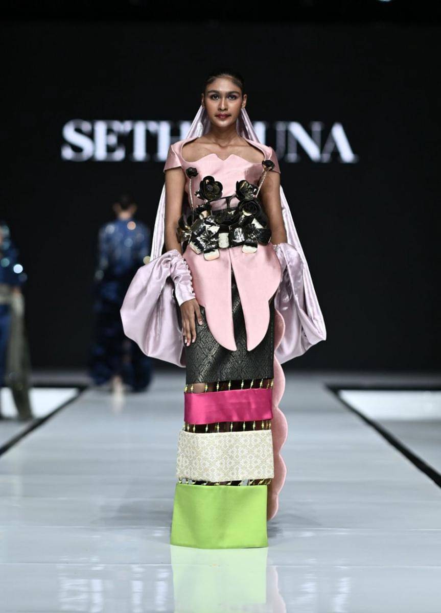 13. Beralih pada koleksi Avant-Garde, SETH&LUNA menyuguhkan busana haute couture Lebaran berupa rok songket unik dan slit top warna pink