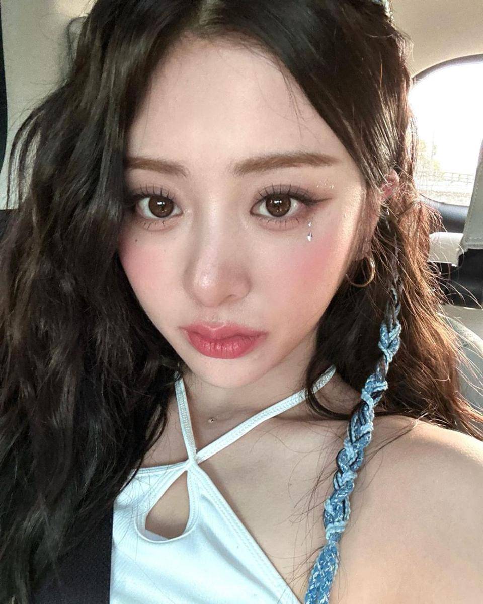 5. Makeup bagian mata Yunjin semakin memikat dengan garis tipis eyeliner yang dilengkapi serpihan stiker di sudut mata dan lashes lentik!