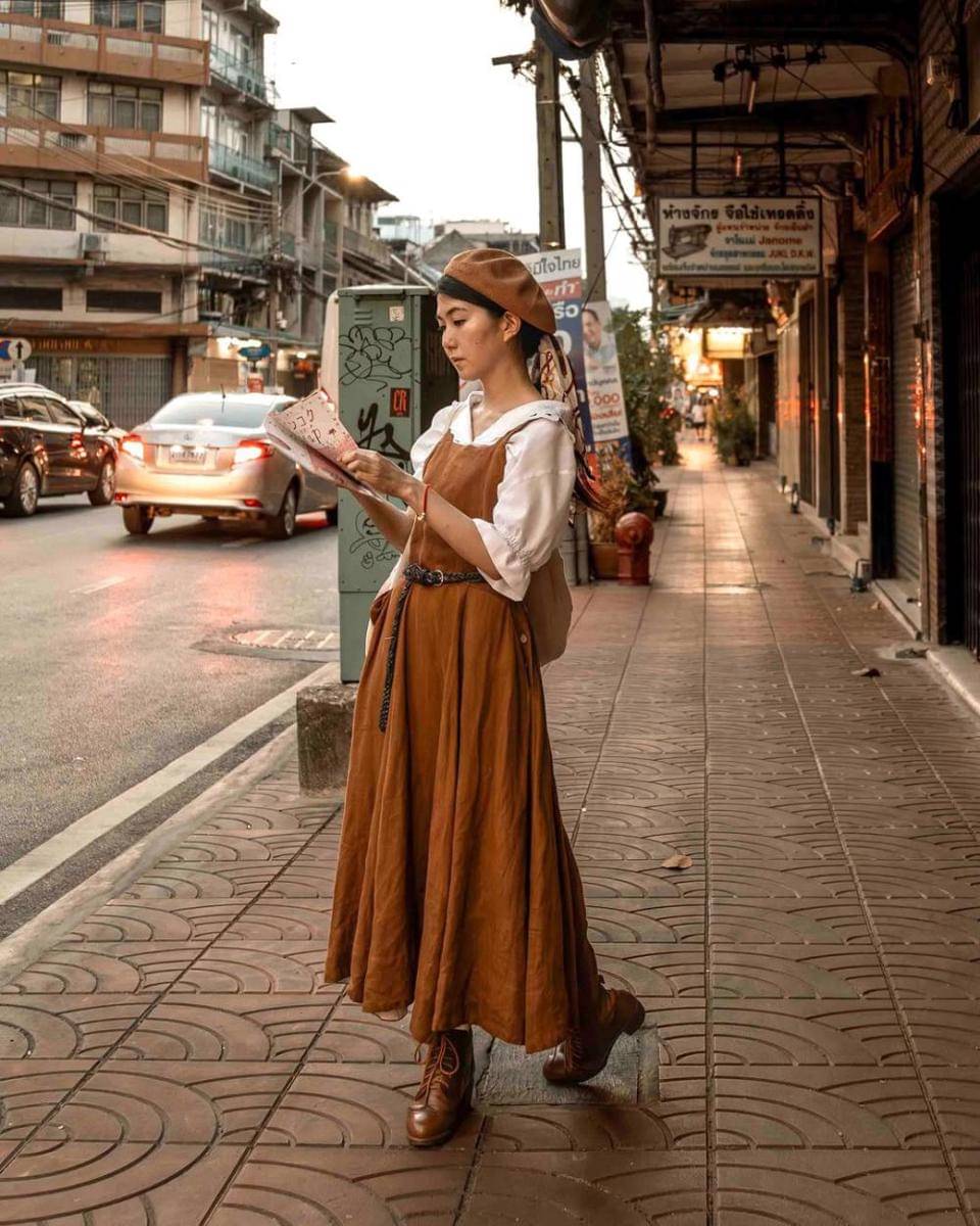 3. Padukan blouse broken white, overall maxi dress, baret dan booties cokelat untuk look yang santai