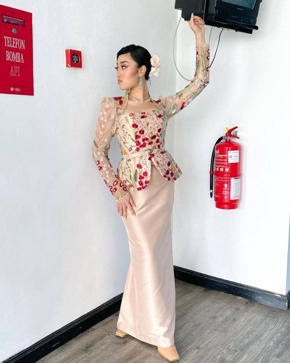 1. Modifikasi kebaya berkerah tinggi dengan potongan peplum, menciptakan look yang lebih feminin. Bikin gaya etnik kian kekinian!