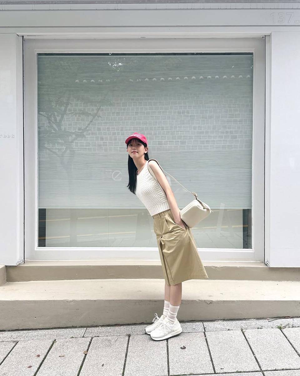 1. OOTD pertama adalah berupa padanan mini skirt khaki dengan sleeveless top dan sneakers putih. Kang Han Na tambahkan topi merah untuk kesan stylish