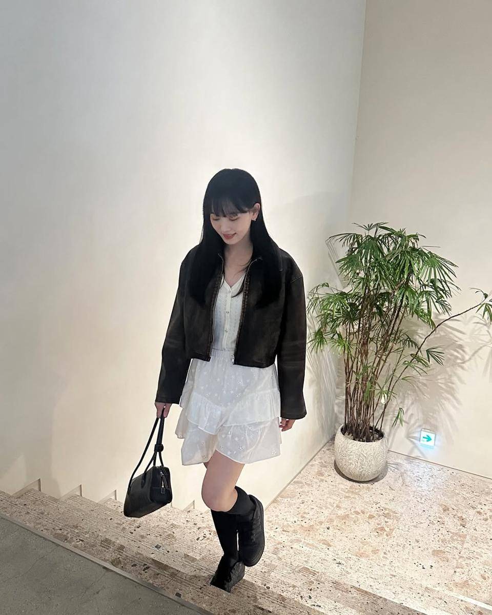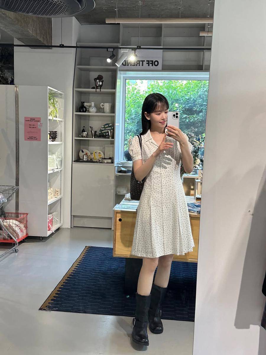 9. Diakhiri dengan girly style yang kalem tapi tetap fashionable, Kang Han Na mengenakan shirt dress putih, boots, dan shoulder bag hitam