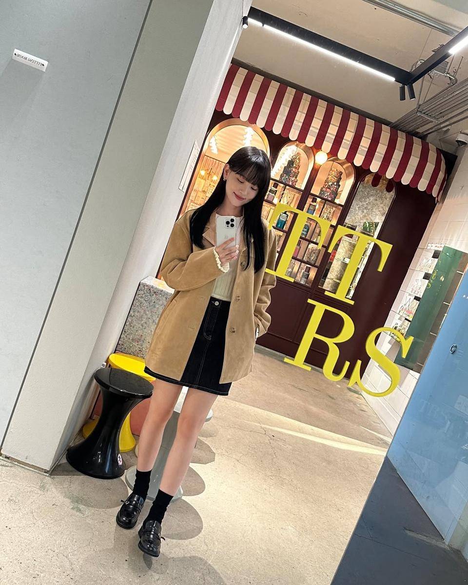4. Menciptakan girly style yang clean nan rapi, Kang Han Na memadukan white top dengan blazer light brown, mini skirt hitam, dan sepatu senada