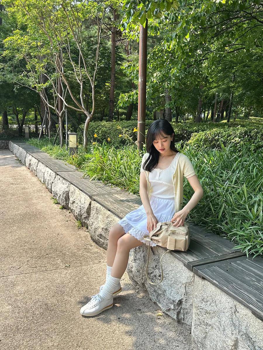 8. Memperlihatkan gaya summer yang catchy, Kang Han Na memadukan blouse dan cardigan cream bersama mini skirt serta sneakers putih