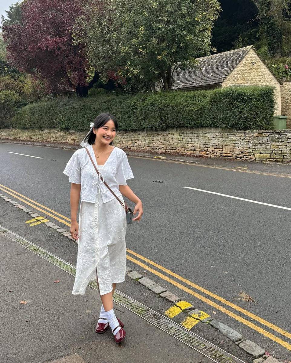 1. Tampil cute dengan outfit kalem, Jesica memadankan collar neck midi dress putih dengan flat shoes warna cokelat mahogany