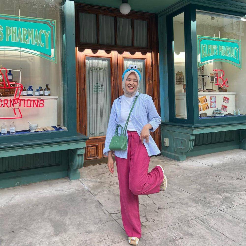 1. Gak hanya pink, look ala Barbie juga bisa bermain warna. Misalnya menggabungkan outer pink dengan sling bag hijau dan celana kuning