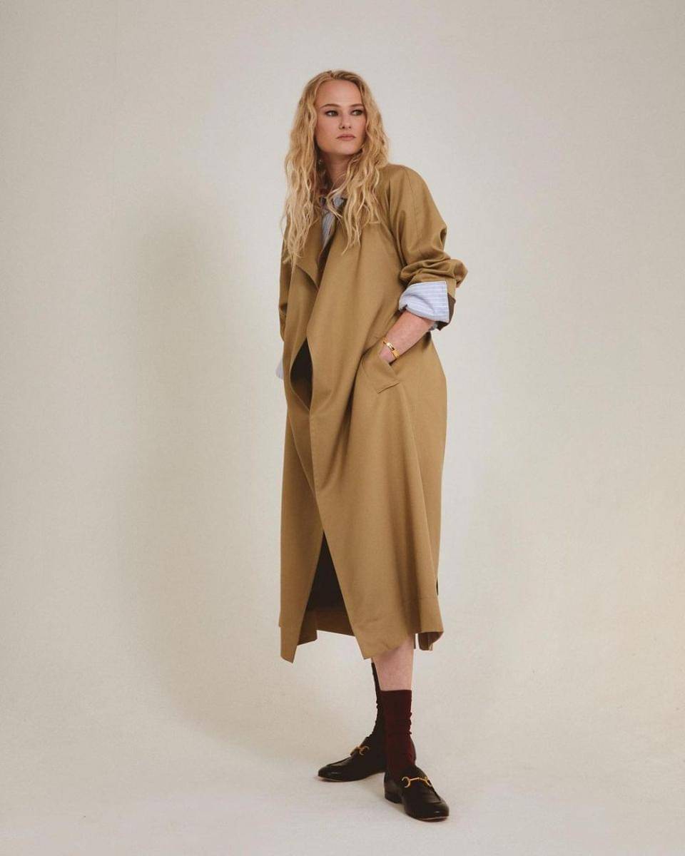 7. OOTD ke kantor, pakai shirt dan midi skirt lalu balut dengan coat. Pakai juga gelang, kaos kaki, dan sepatu loafers