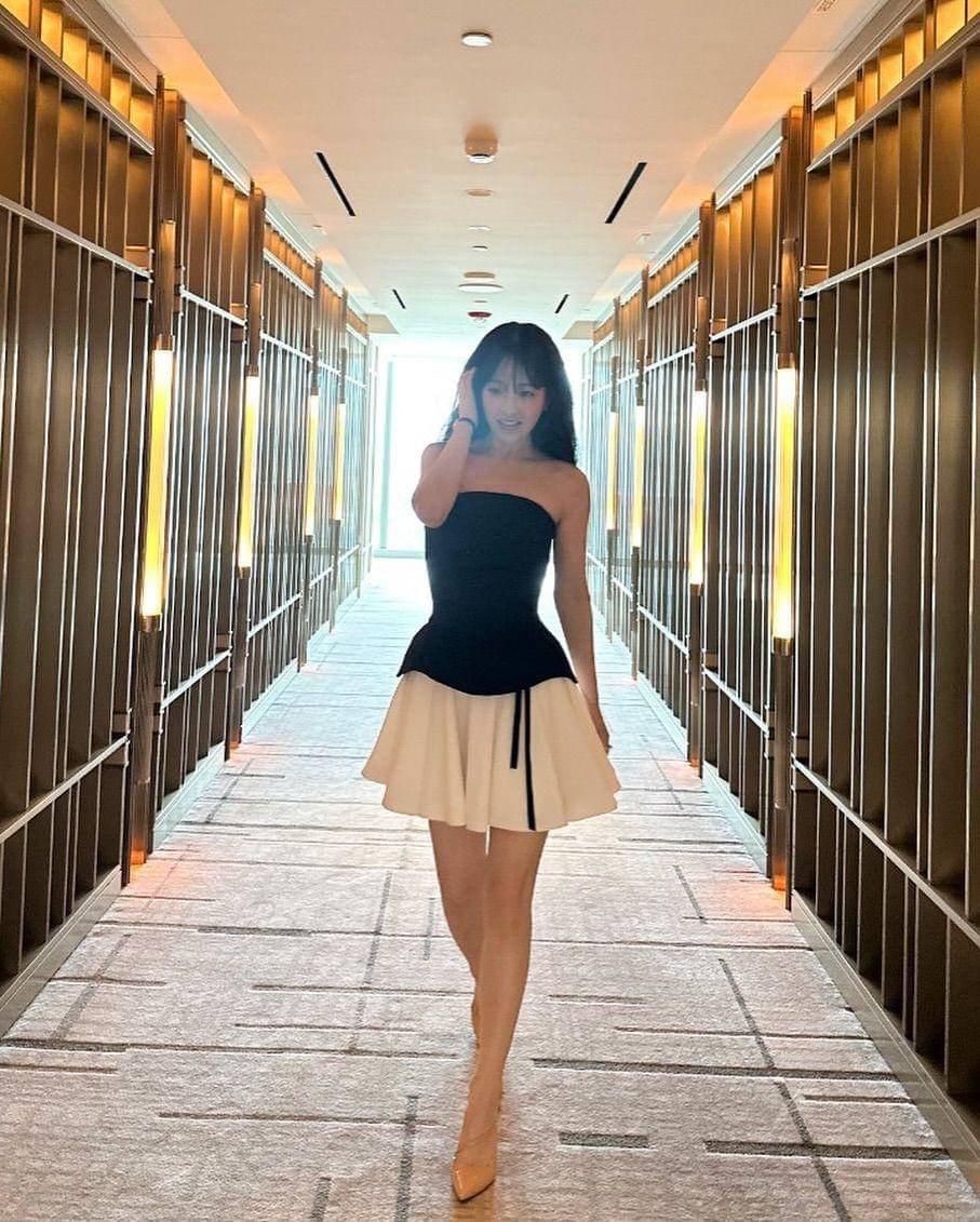 7. Di momen lain, Seolhyun memakai midi dress yang memiliki potongan di bagian pinggang, sehingga membuatnya tampak anggun