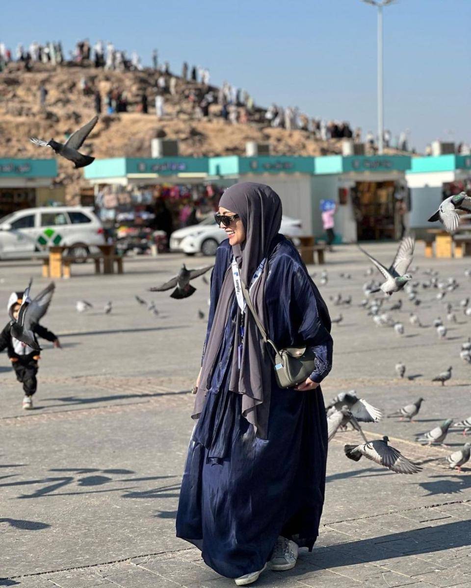 5. Saat umroh, busana putih dengan potongan lebar hadir tanpa banyak dekorasi. Penampilannya kian syahdu berkat jilbab panjang yang menutupi dada