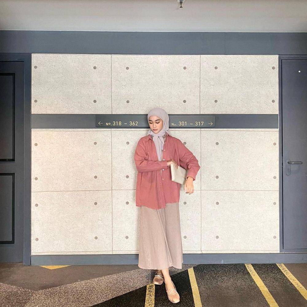 7.Ravira memadukan rok plisket berwarna nude dengan oversized shirt warna pink sebagai atasannya. Gemas banget sama outfit satu ini