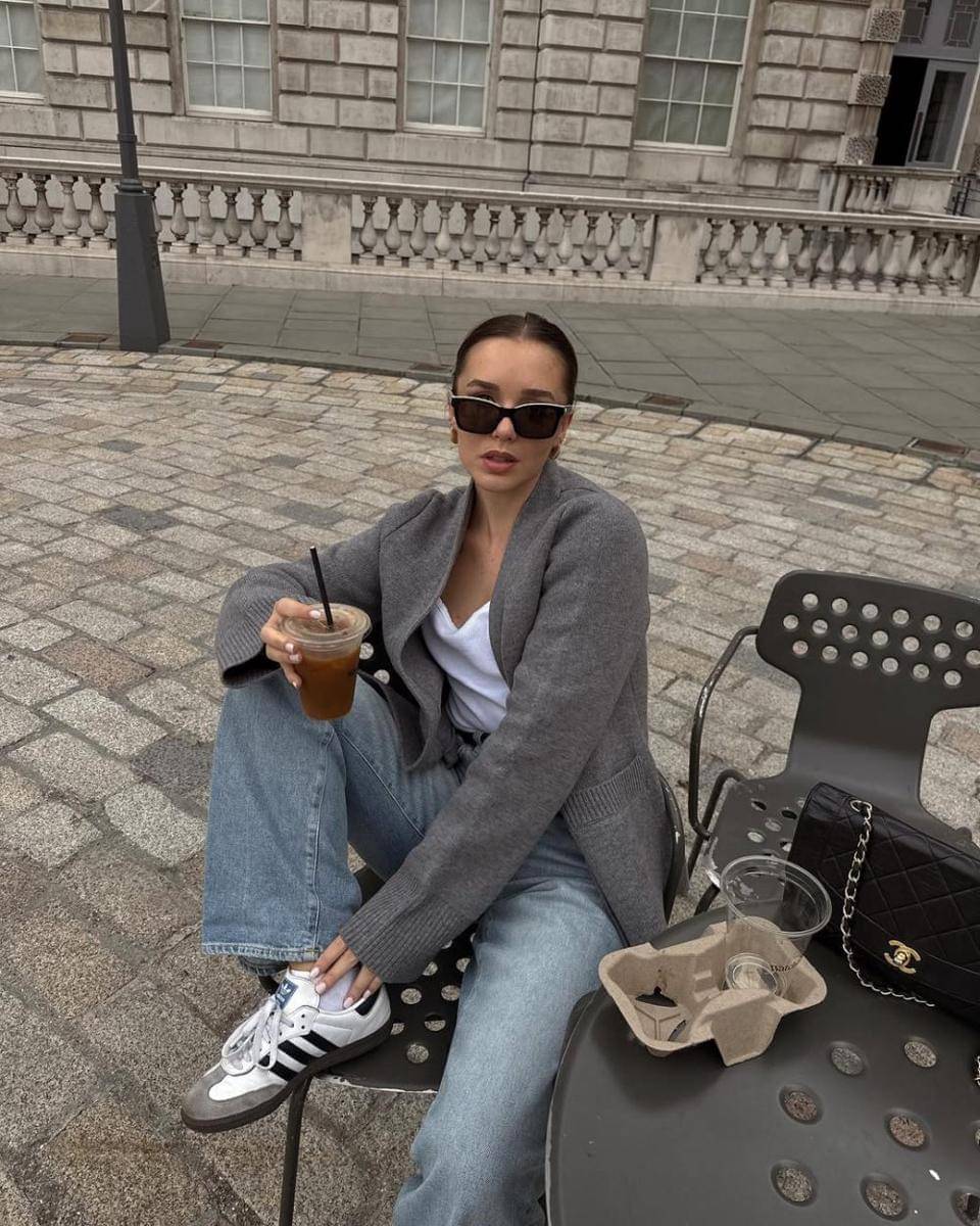 1. Raffan layering white t-shirt dengan cardigan rajut abu-abu. Lalu, dipadukan dengan high waisted jeans dan sneakers samba