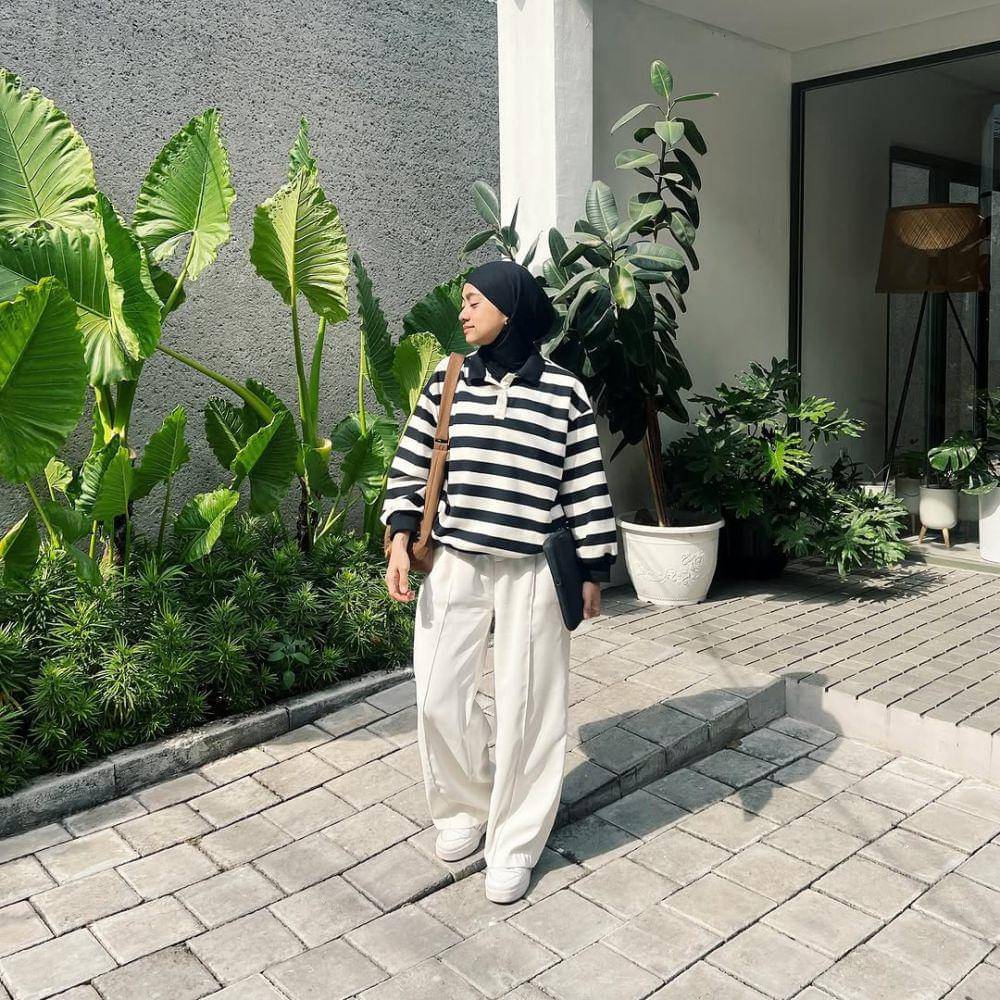 1. Kamu bisa tampil kasual nan trendi dengan sweater garis-garis, hijab warna hitam, tote bag, serta trousers pants dan sepatu sneakers putih