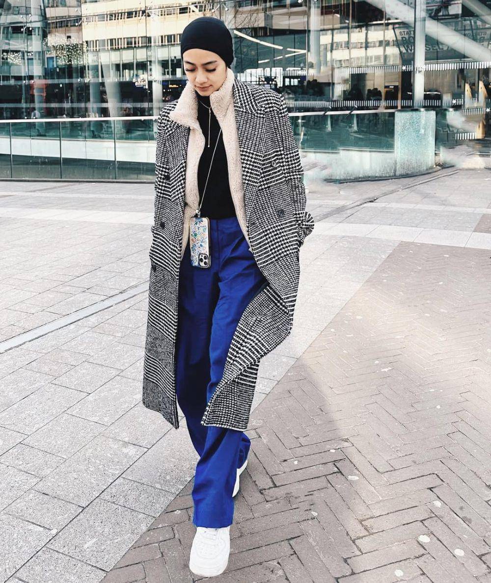 7. Selain gak kedinginan, kombinasi turtleneck sweater, long coat motif houndstooth, dan celana panjang warna biru elektrik ini juga fashionable